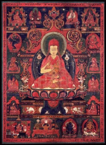 Above a multi-coloured lotus, Mahakala is surrounded by the stylized flames of pristine awareness and emanating forth from the licks of flame are messengers in the shapes of various animals, black crows, black dogs, wolves, black men and women.