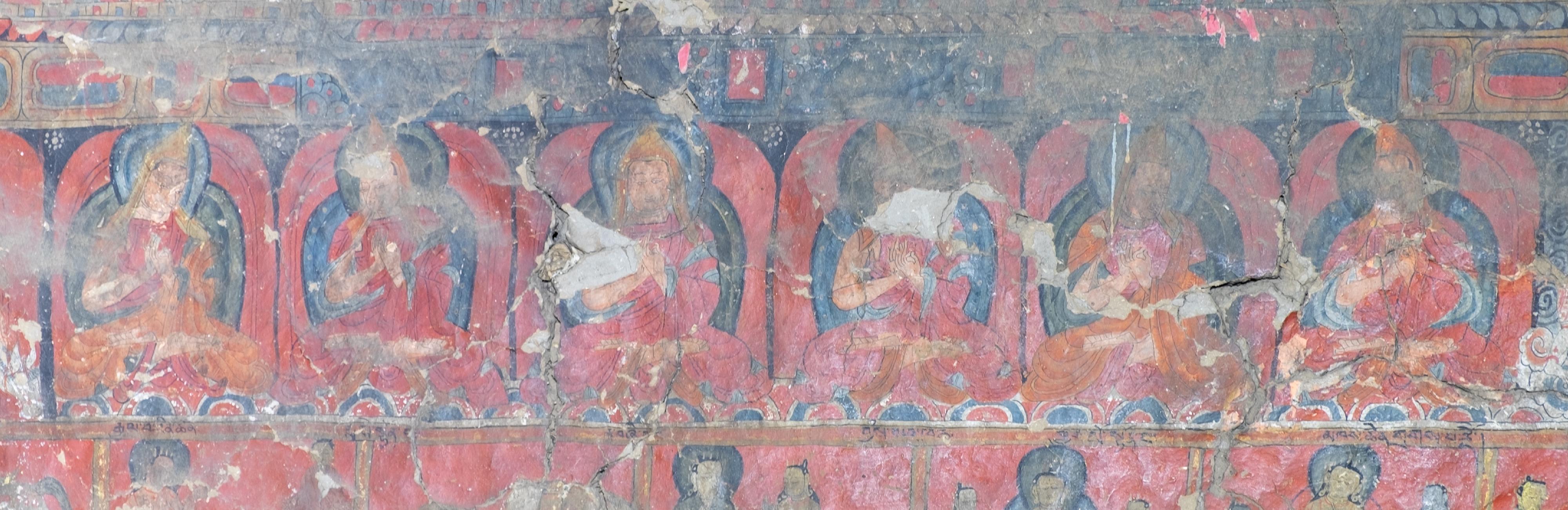 This early 16th-century mural from the region of Dartsedo is the only known ancient group depiction of the Five Scholars of Minyak, five masters who flourished in Minyak Rabgang during the 14th century. Each figure is identified by small captions in headed script. A sixth figure is labeled Khe[pa] chen[po] Drakpa Dorje. The six figures are illustrated uniquely. In particular Rigpa Sengge is said to have been one legged after having been bitten by a snake during his teenage years. The remains of a red poster pasted on the walls during the Cultural Revolution can be spotted in the upper right section of the photograph, which was taken by JB Georges-Picot in 2018.