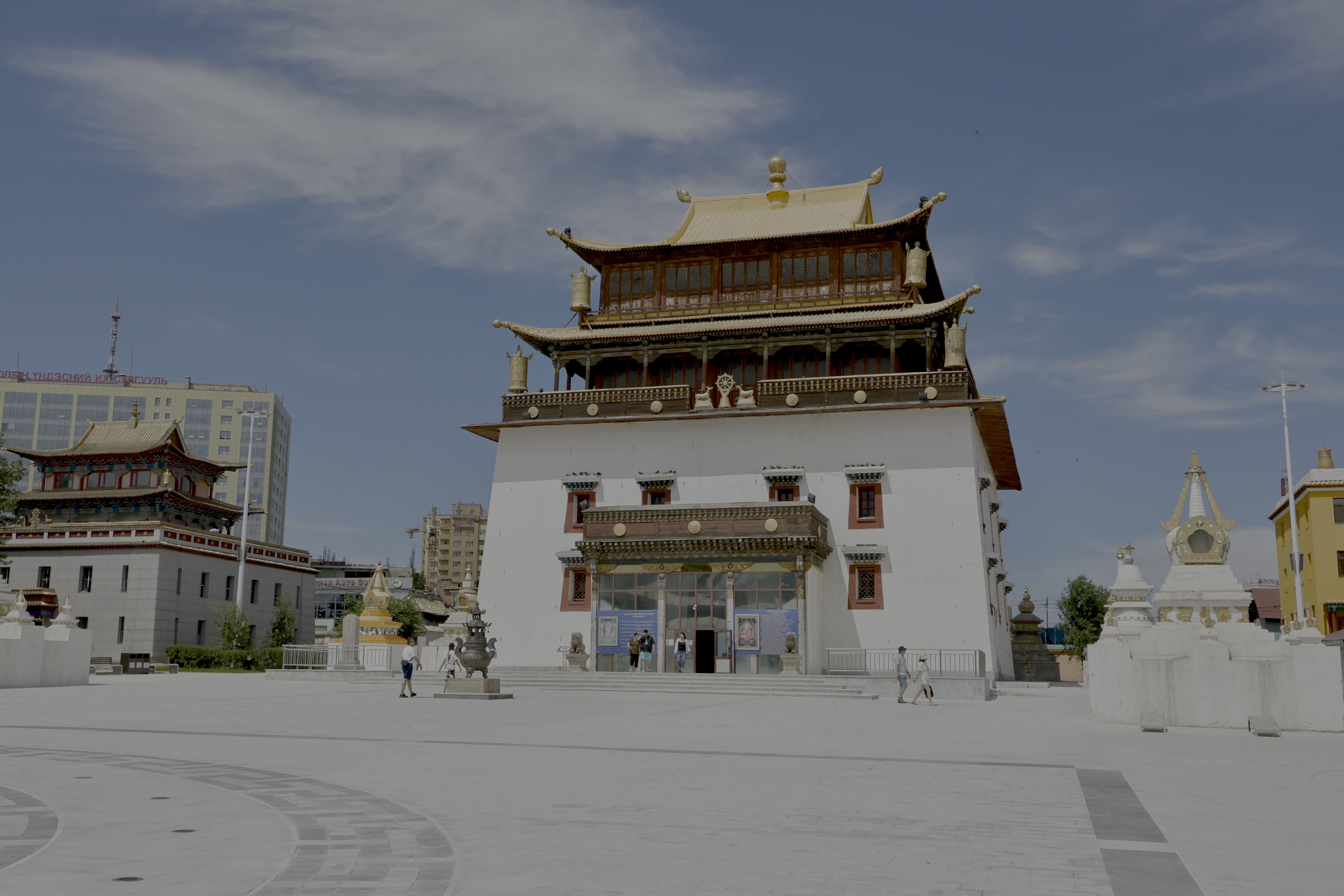 Ganden Tegchenling is a major Geluk monastery in Ulaanbaatar, Mongolia that has been actively revitatized since 1990. It emerged out of the many temples and monasteries of Khuree that were developed beginning in the 17th century. Gandan was part of the Baruun Khuree, or the western section of the monastic city.